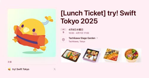 try! Swift Tokyo 2025 にご参加の皆様へ、ランチに関する重要なお知らせです。 ランチのご提供について 今年は会場の制約により、会場内でお弁当を食べることができません。そのため、昼食は会場付近の飲食店をご利用いただくか、希望者向けにオプション販…